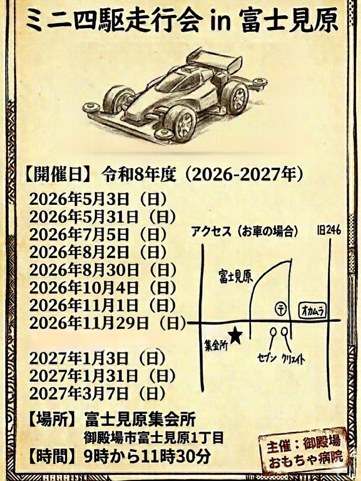 2026年度「ミニ四駆走行会 in 富士見原」開催 今年度も、御殿場おもちゃ病院のミニ四駆走行会を開催します。 【お知らせ】 今年度より会場が「くすのき」から「富士見原集会所」へ変更になります。 どなたでも大歓迎です。開 […]