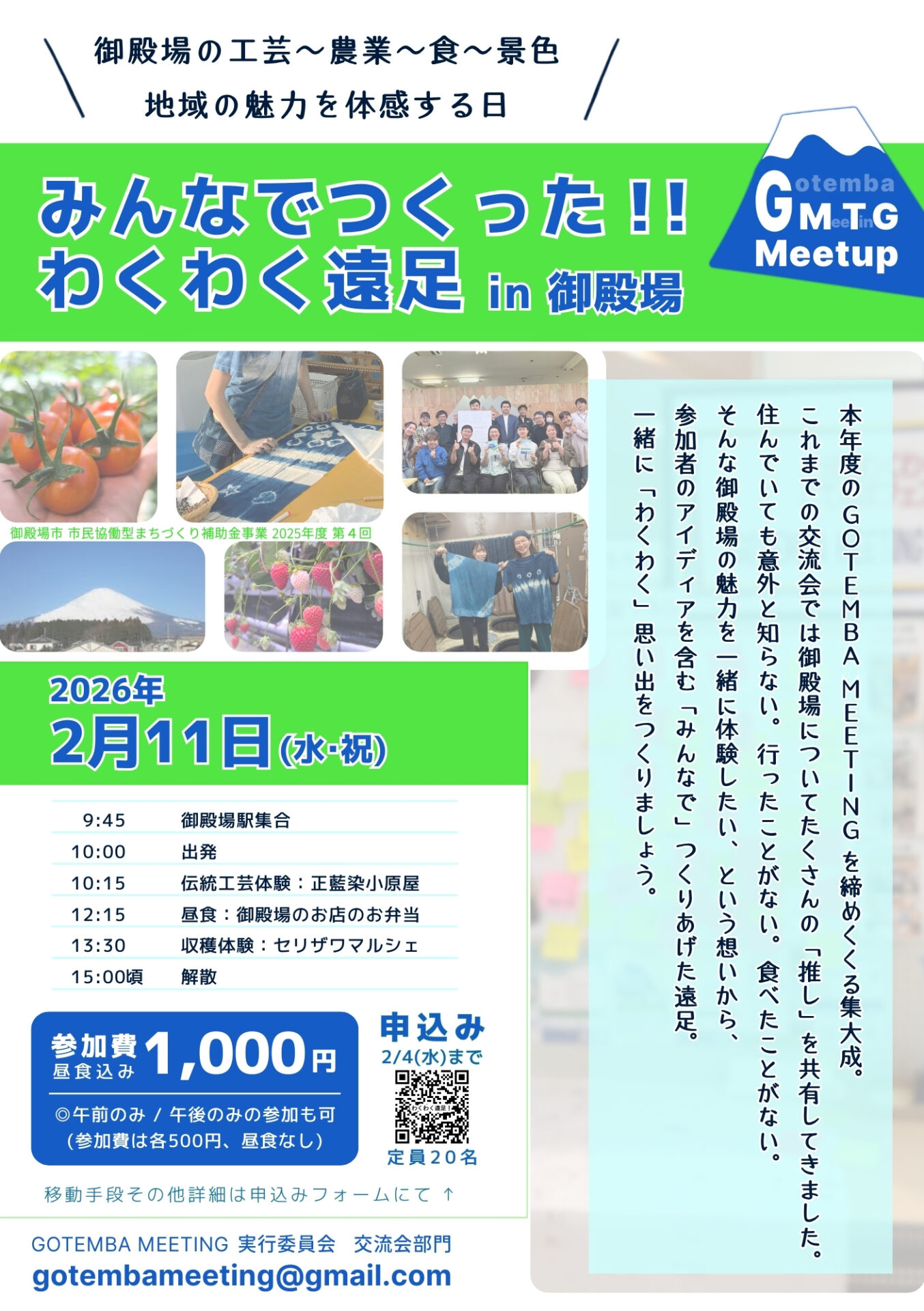 これまでの参加者やアンケートなど 「みんな」のアイディアをありがとうございます! ◤みんなでつくった!! わくわく遠足 in御殿場◢ *御殿場の 伝統工芸・農業 を体験 *昼食は市内のお店のお弁当 ぜひ一緒に出かけましょ […]