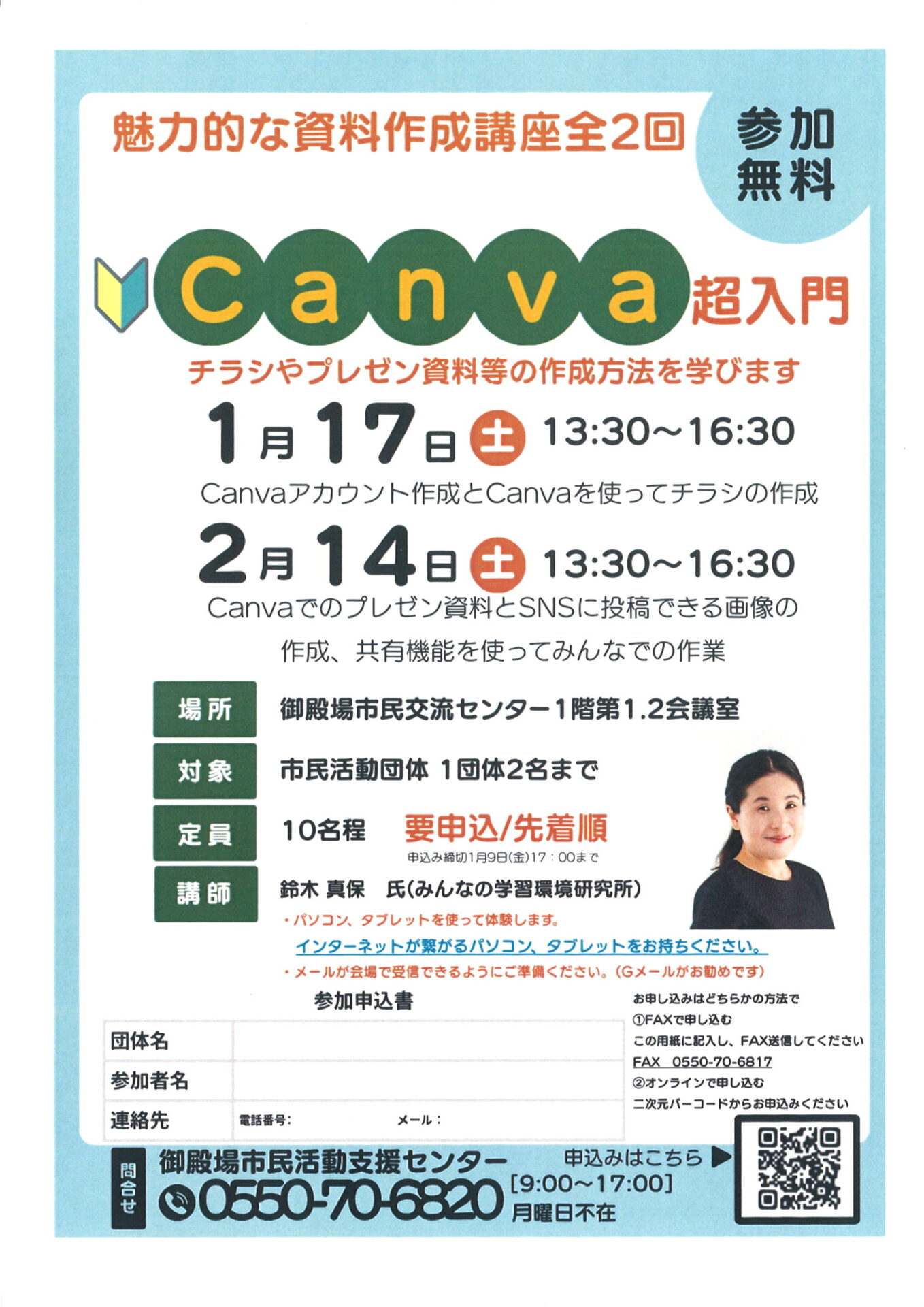 2月14日(土)13:30~16:30 Canvaでのプレゼン資料とSNSに投稿できる画像の作成、共有機能を使ってみんなでの作業 - 場所:御殿場市民交流センターふじざくら1階 第1.2会議室