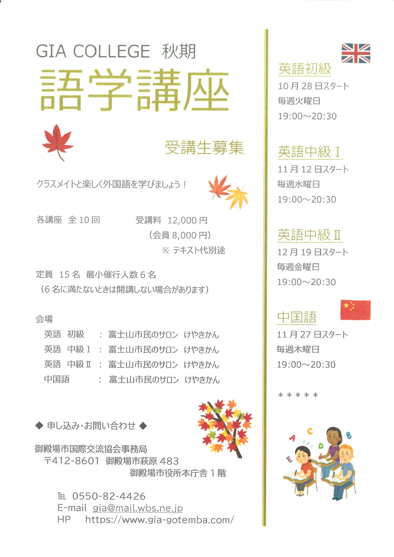 GIA COLLEGE 秋季 語学講座 受講生募集|御殿場市国際交流協会