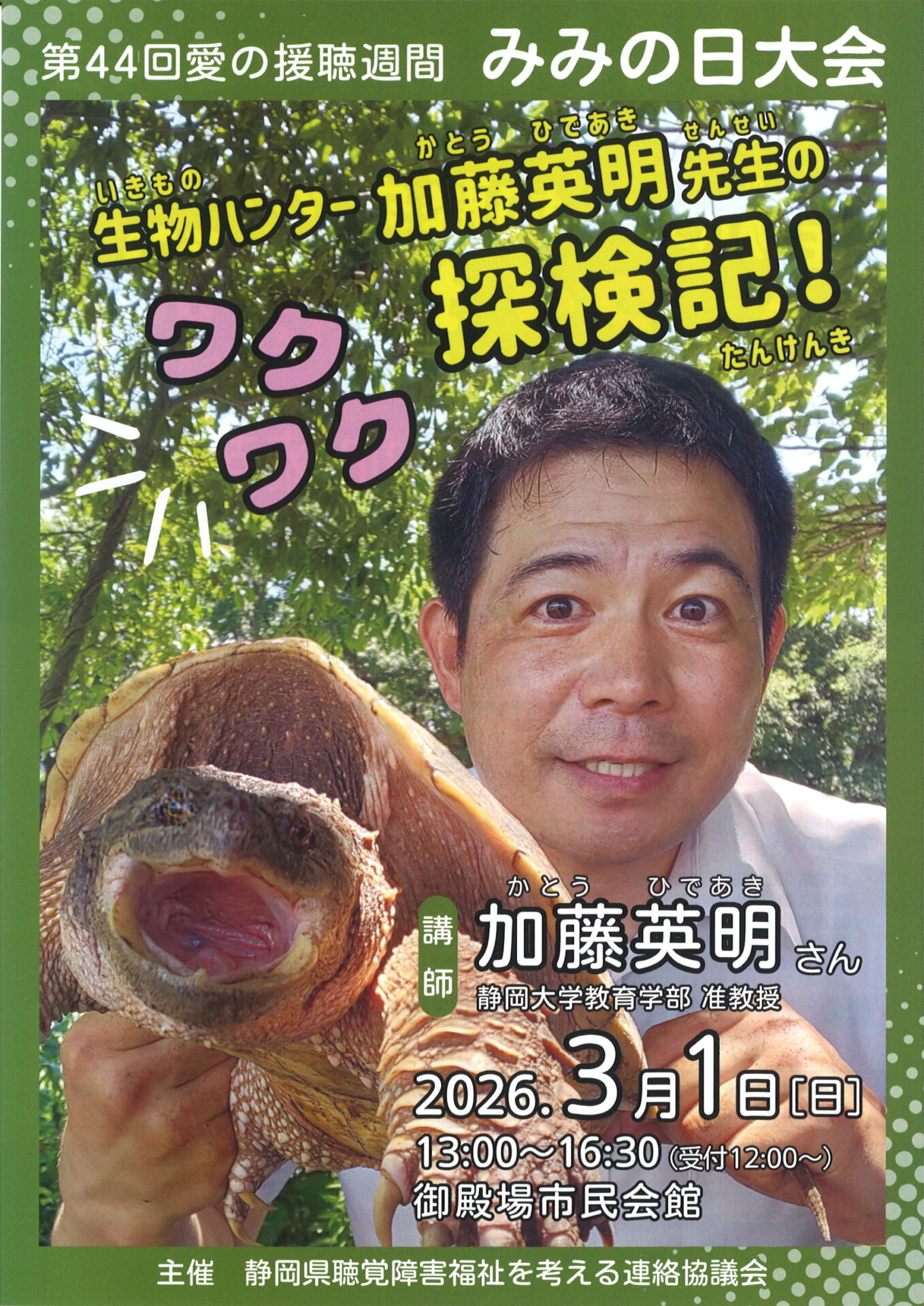 講師:日本テレビ「ザ!鉄腕DASH」やテレビ東京「緊急SOS!池の水ぜんぶ抜く大作戦」に出演の静岡大学教育学部准教授 生物学者(農学博士) 加藤英明氏