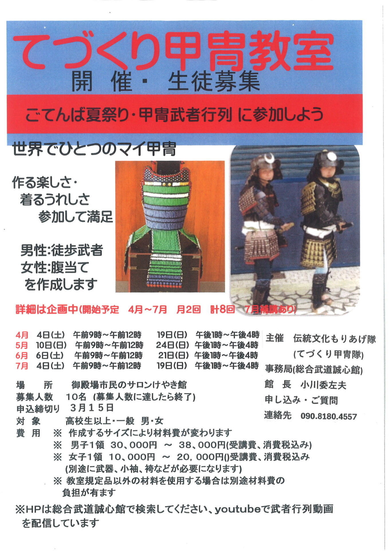 ※教室規定品以外の材料を使用する場合は別途材料費の負担があります - ※HPは総合武道誠心館で検索してください、youtubeで武者行列動画を配信しています